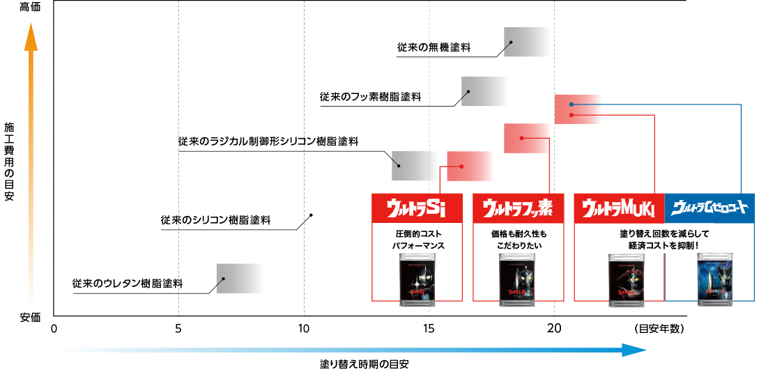 こんにちは(*'▽') 鈴吉ペイント東近江・近江八幡支店です。 今回は、おすすめ塗料のご紹介をしたいと思います! ウルトラシリーズ ・ウルトラSi ・ウルトラフッ素 ・ウルトラクリヤー ・ウルトラ無機 それぞれに特徴があり、一人一人のお家に特価した塗料をオススメしております。 弊社は特約施工店ということもあり、メーカー保証はプレマテックス社から、施工保証は鈴吉ペイントからのW保証なので安心です! 人と環境、そしてこの地球の未来も考えたこれからの塗料、「ウルトラシリーズ」 低価格にして高性能 住宅の塗り替えに使用する塗料は種類によって価格や耐候性が異なります。ウルトラシリーズは低価格にして高耐久を実現。従来の同等クラスの塗料より塗り替え周期が長いため、一度塗装すれば長期間塗り替えを行う必要がありません。 施工費用と塗り替え目安の比較 ウルトラシリーズはクラス最高の耐候性と優れたコストパフォーマンスにより、圧倒的なライフサイクルコストの低減をかなえます。 ウルトラシリーズはクラス最高の耐候性と優れたコストパフォーマンスにより、圧倒的なライフサイクルコストの低減をかなえます。 さらに塗り替え周期を延ばしたい方 +「ウルトラTOP」で塗り替え目安を延長! 紫外線に強く、高い機能性を備え、安心・安全性と低環境負荷もかなえた次世代の1液水性塗料。 コストパフォーマンスを維持しながら塗り替え目安の延長を実現 帰りたくなる家をモットーに 鈴吉ペイントは外壁診断士現場経験10年以上の実績と資格を持った診断士があなたのお家を診断します。 塗装の金額だけでも知りたい! 塗装したほうがいいかな? 雨漏れが気になる💦 お家の健康診断をしてほしい!! そんな方!一度お問い合わせください! 戸建 マンション アパート改修工事 外壁塗装 屋根塗装 屋根工事 外構エクステリア 床 クロス 電気 エアコン シロアリ対策 サッシ 網戸 トイレ キッチン 解体工事 を主に施工させていただいております! お家のお悩みがありましたらお気軽にお問い合わせください! 滋賀県は店舗のあります、東近江・近江八幡支店を始め、大津市、草津市、栗東市、野洲市、甲賀市、湖南市、東近江市、近江八幡市、日野町、竜王町、彦根市、愛荘町、豊郷町、甲良町、多賀町、米原市、長浜市、高島市をメインに施工させていただいております。もちろん京都府、大阪府、三重県も喜んで行かせていただきます! 外壁塗装、屋根塗装は是非鈴吉ペイント東近江・近江八幡支店をご検討下さい^_^
