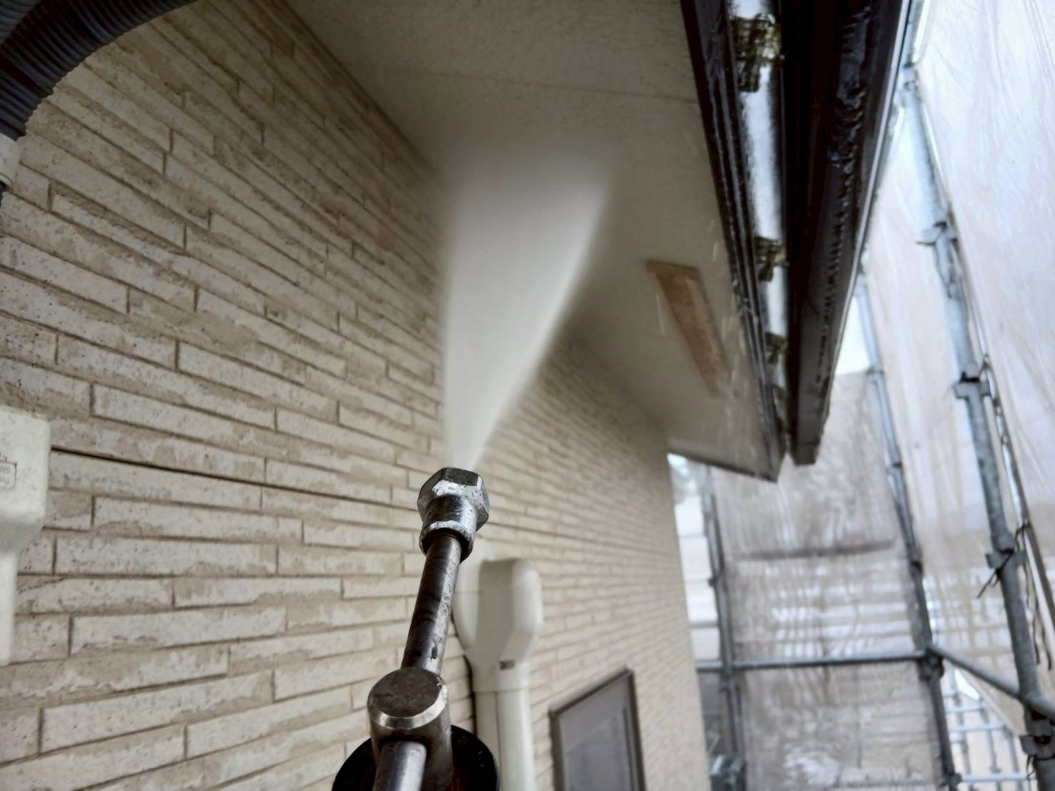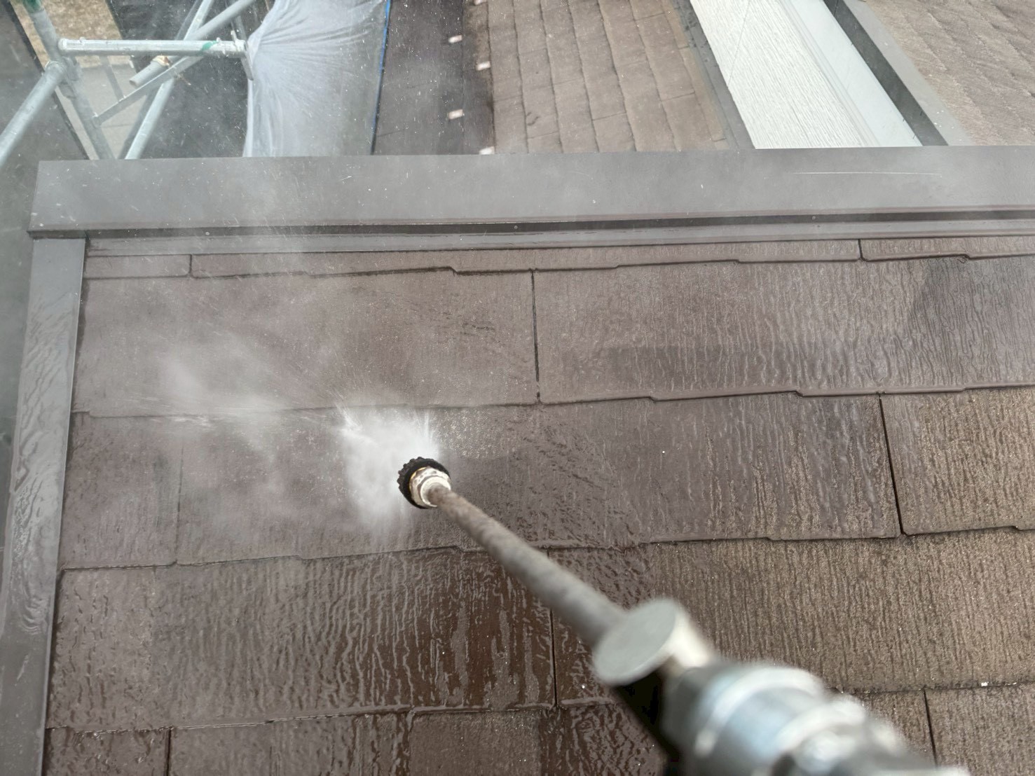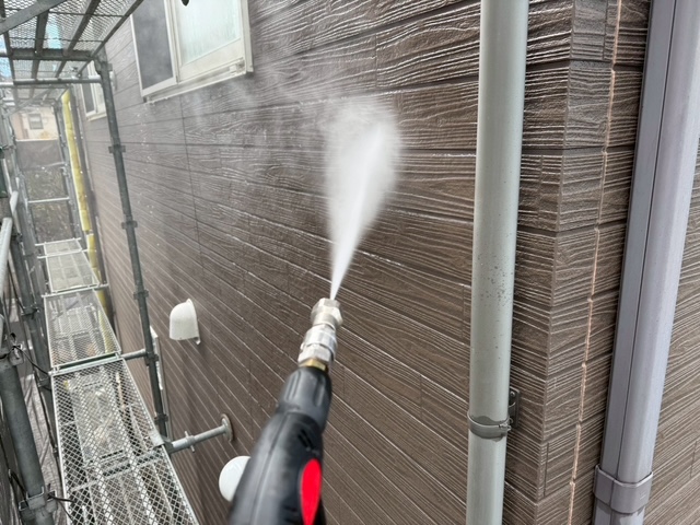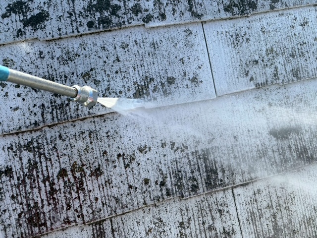 外壁塗装工事や屋根塗装工事では、塗装前(塗料を塗る前)に、高圧洗浄機を使用して、高圧の水で外壁に付着した汚れや傷んだ旧塗膜などを洗い流します。