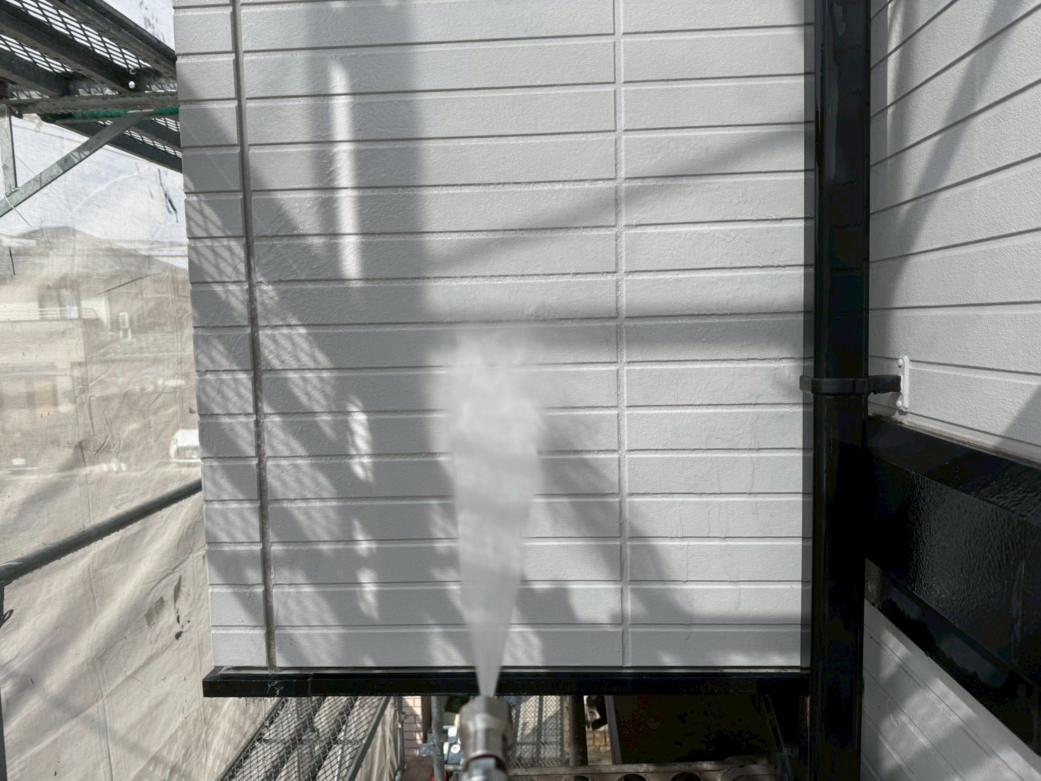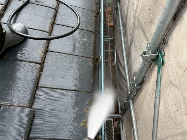 外壁塗装工事や屋根塗装工事では、塗装前(塗料を塗る前)に、高圧洗浄機を使用して、高圧の水で外壁に付着した汚れや傷んだ旧塗膜などを洗い流します。